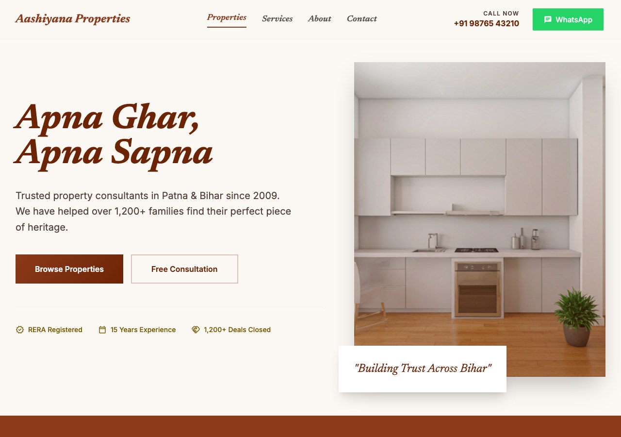 Real estate & property business template with listings, amenities, and enquiry CTA.