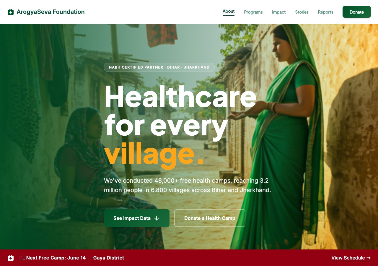 Health & sanitation NGO with programme pages, beneficiary stats, and CSR partnership form.