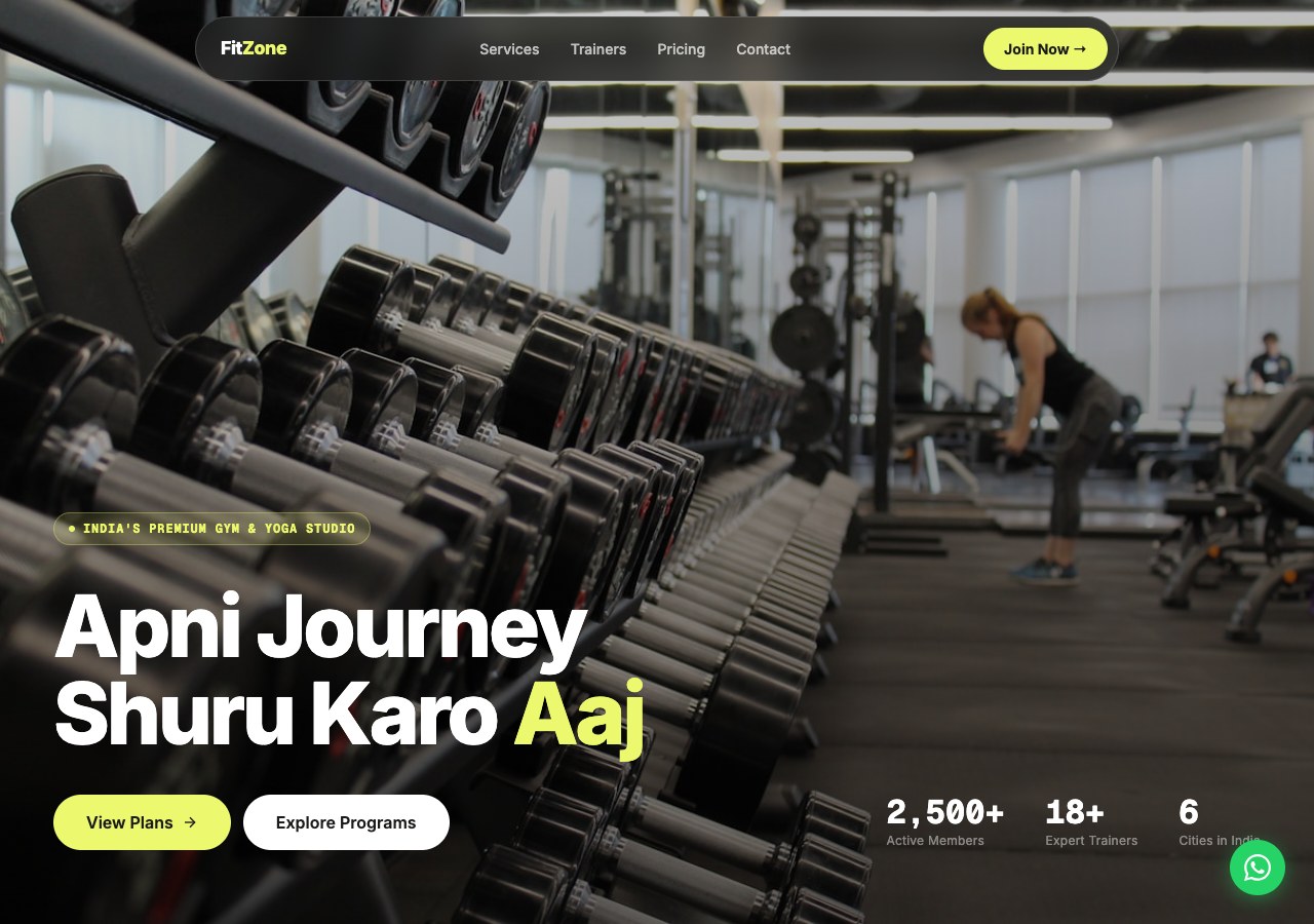 High-energy gym with membership plans, trainers, and WhatsApp join flow.