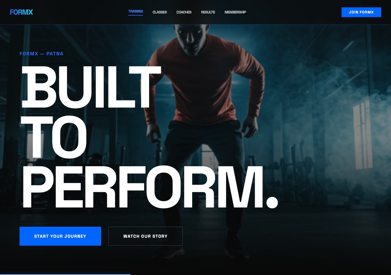 High-performance gym brand with diet plans, trainer app CTA, and corporate wellness.