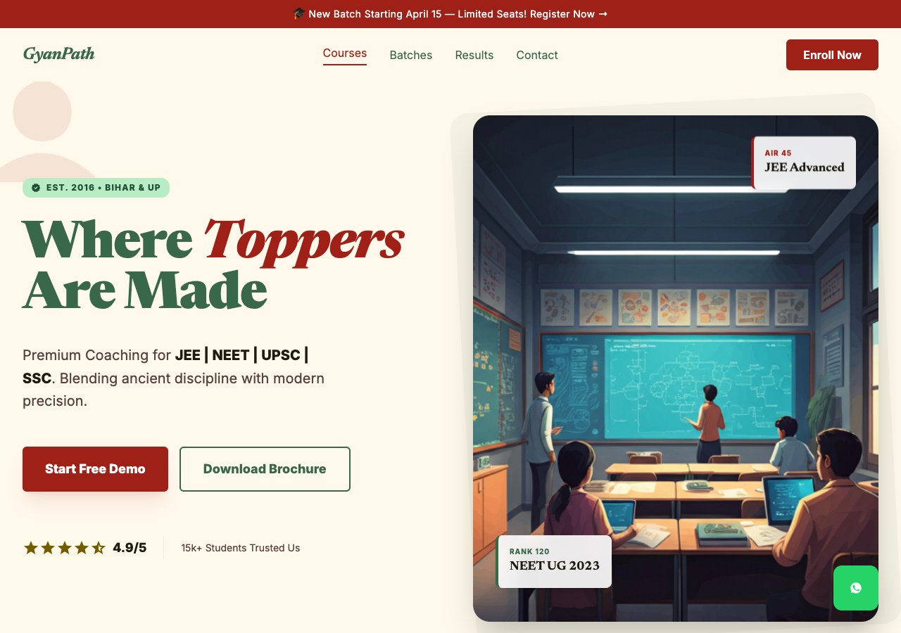 Coaching centre with subject cards, batch schedule, and result testimonials.