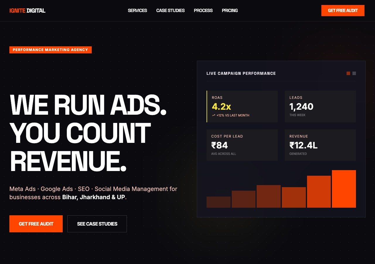 B2B services company with case studies, client logos, proposal request, and blog.