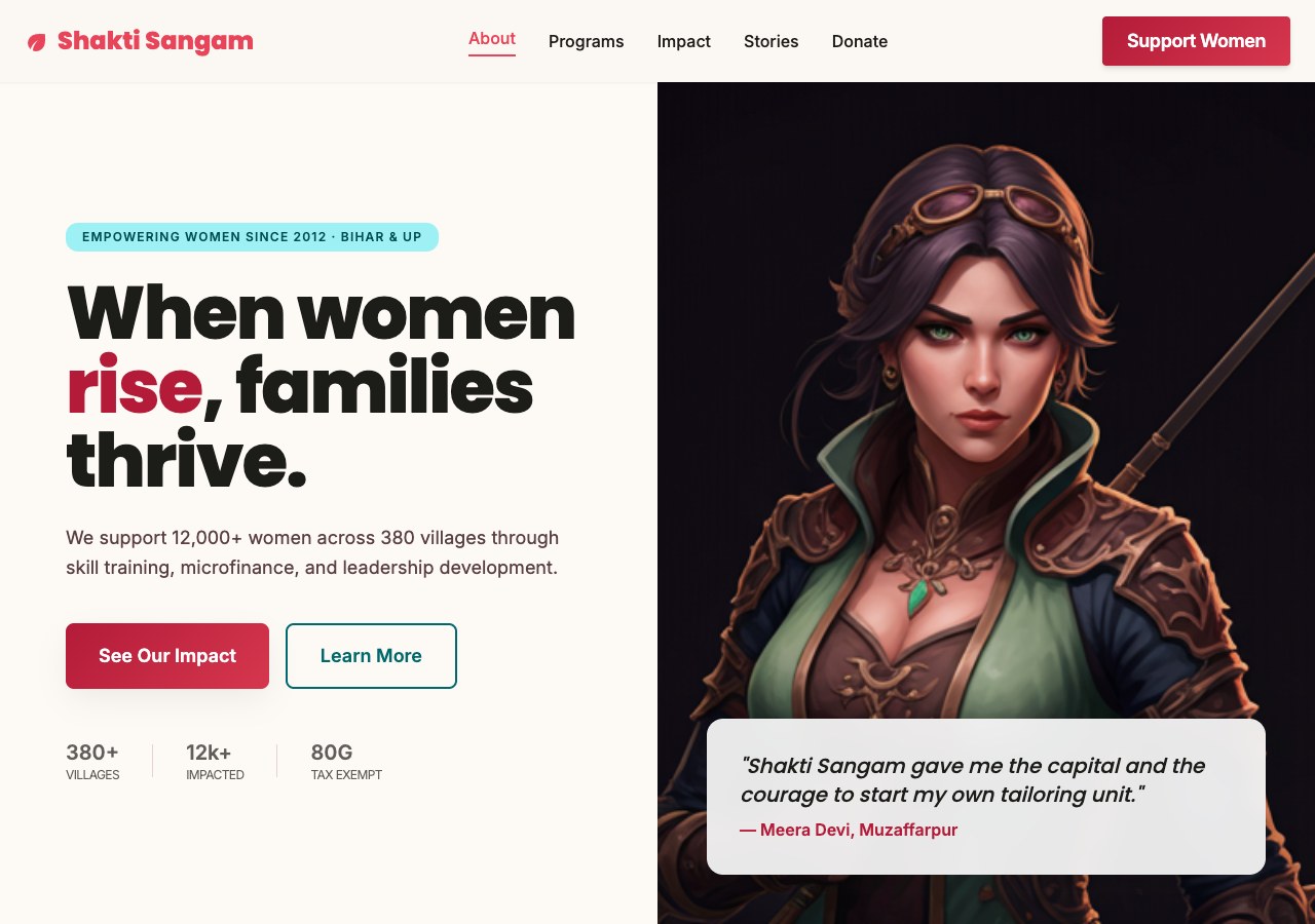 Women empowerment NGO with impact stories, events calendar, and partner logos.